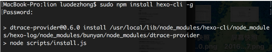 sudo npm install hexo-cli -g命令,全局安装Hexo在命令行前面多加 sudo 是为了获取权限,可能需要输入密码(Mac 才需要)