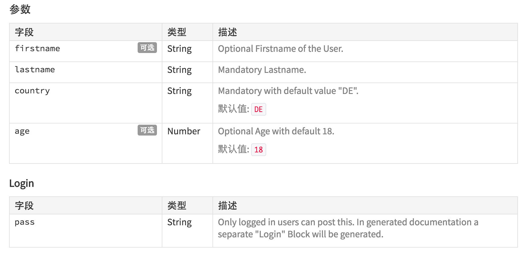 @apiParam [(group)] [{type}] [field=defaultValue] [description]示例代码如下: