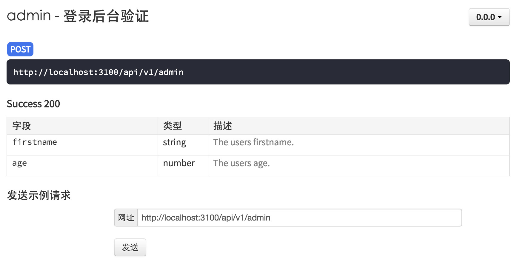 @apiSampleRequest url接口测试地址以供测试,发送请求时,@api method 必须为 POST/GET 等其中一种,该参数也可以在之前的配置文件中统一配置