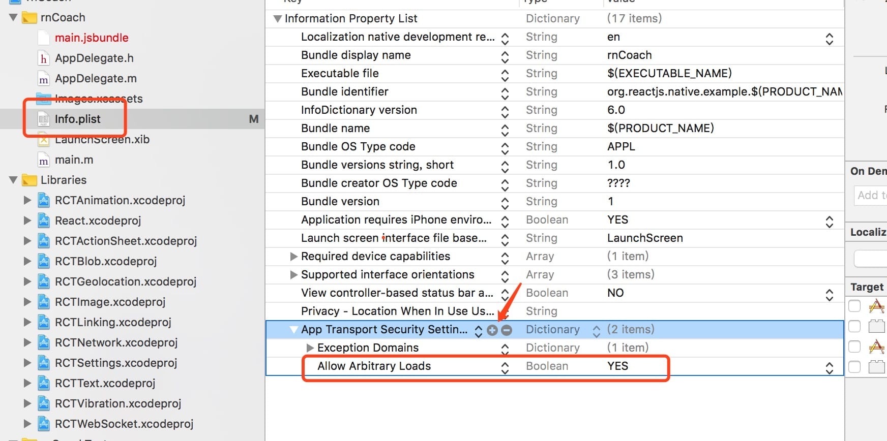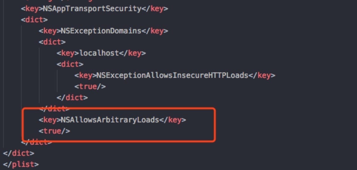 解决方案: 修改 RN 项目中的 ios 文件夹下的项目文件内的Info.plist文件,如图添加下面代码