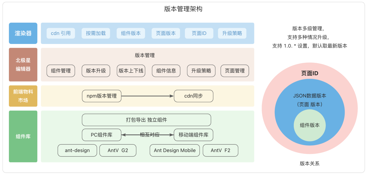 为了解决上面的问题,保障页面性能和准确的版本控制。我们使用的cdn方式,我们将每次发布的后的组件都上传至cdn,再通过组件类型、组件版本等字段拼接cdn链接,最后通过ajax请求动态获取组件文件,渲染成相应的组件,提供给页面使用。这也是为什么,我们需要对现成可用的antd组件,进行简单封装上架到北极星。另外我们后续还将提供更加灵活的升级配置,支持快速、批量修复线上bug。