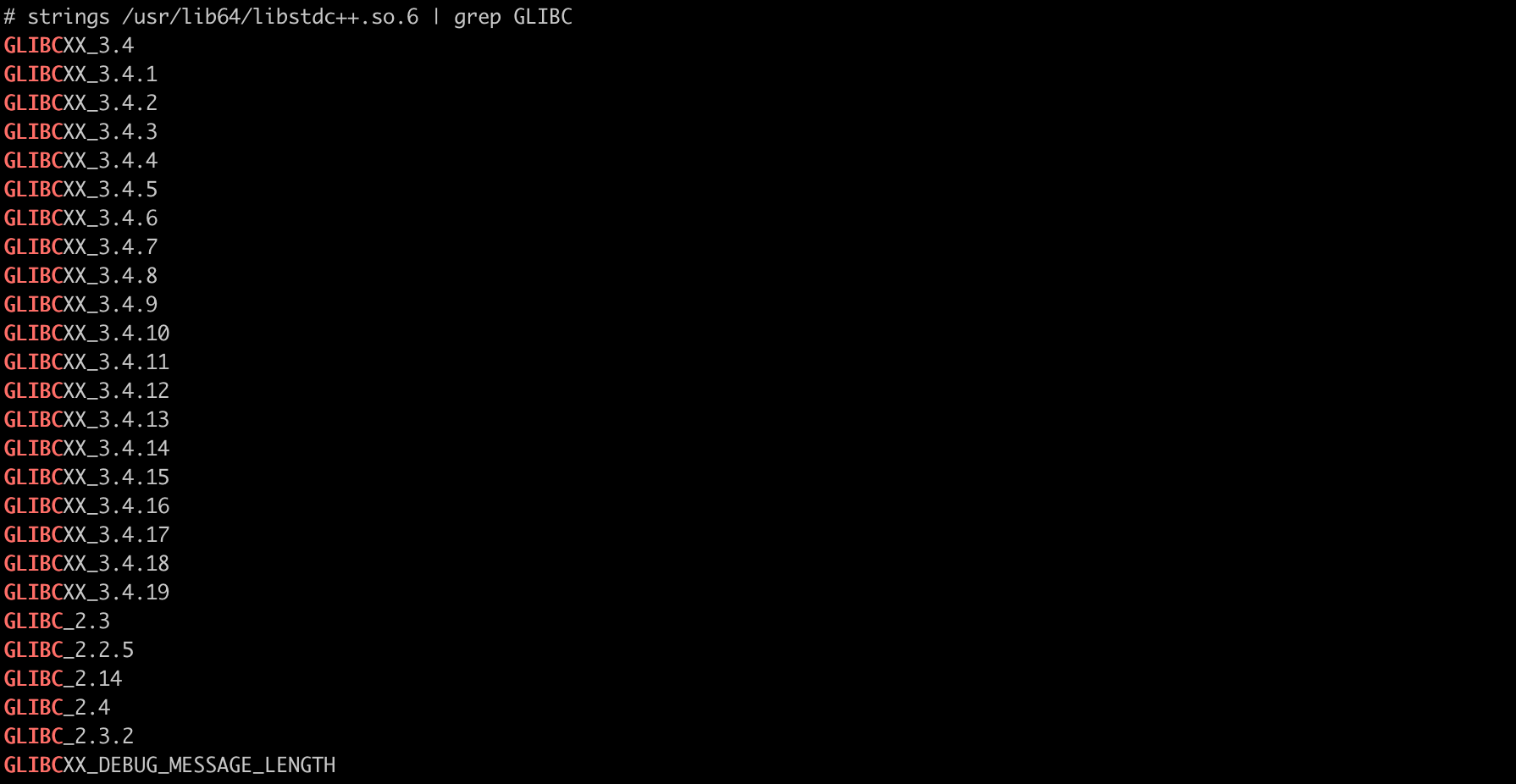 strings /usr/lib64/libstdc++.so.6 | grep GLIBC